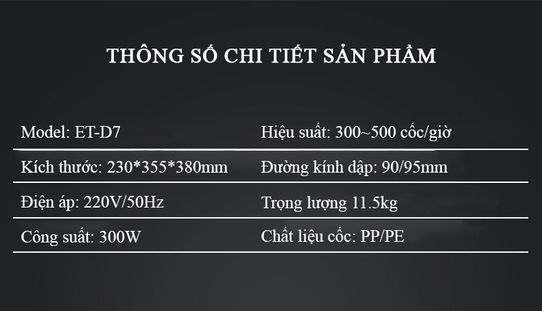 + Dập được nhiều cỡ ly từ 300ml - 700ml. Đường kính miệng ly 9 - 9.5cm